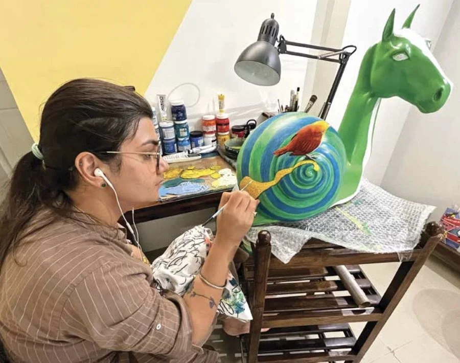 Yashika's artworks are a stream of both sub-consciousness and consciousness, resonating with things she observes around her and her imagination - nature being the significant window of ideas. The movement she has experienced can be seen in her artwork through the elements in her works. So often this thought strikes her: what if they take back what belongs to them? Can our furniture grow back? Are we taking all the food away from them? Can they grow their food on them, so that they never go to sleep on an empty stomach?
